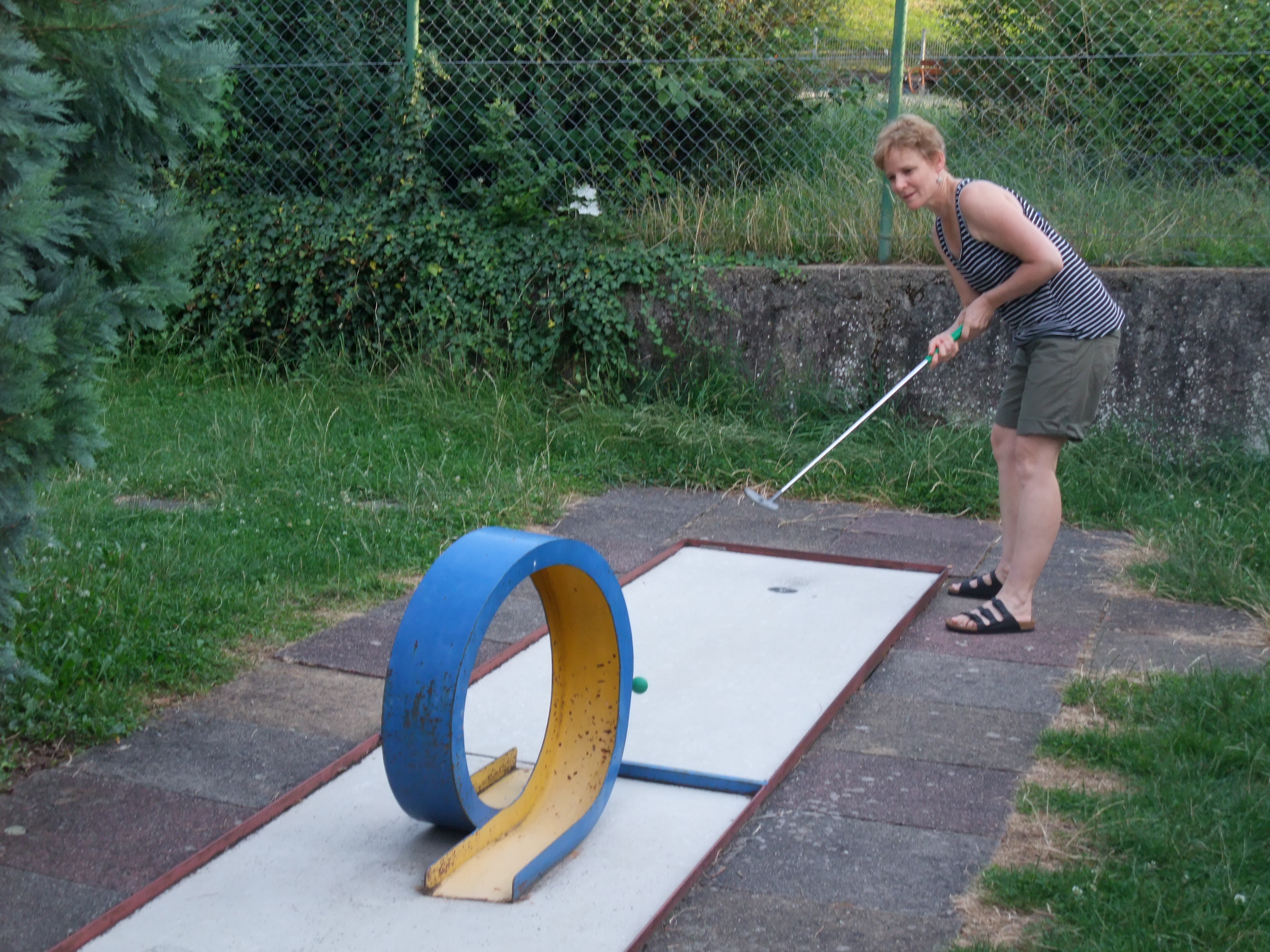 Zugegeben, Minigolf gehört nicht gerade zu den hippesten Sportarten. Vor allem nicht, wenn die Hindernisse auf den Bahnen ein bisschen angerostet sind, die Wurzeln eines Baums, der nicht gefällt werden darf, die Platten wegdrücken, und man die Punktezahl tatsächlich von Hand (!) mit einem Bleistift (die Jüngeren unter uns sollen sich von den Älteren erklären lassen, was das ist), auf einem vorgedruckten Karton aufschreiben muss. Ganz ohne App! Und dann muss man auch noch das Endergebnis von Hand zusammenzählen!!