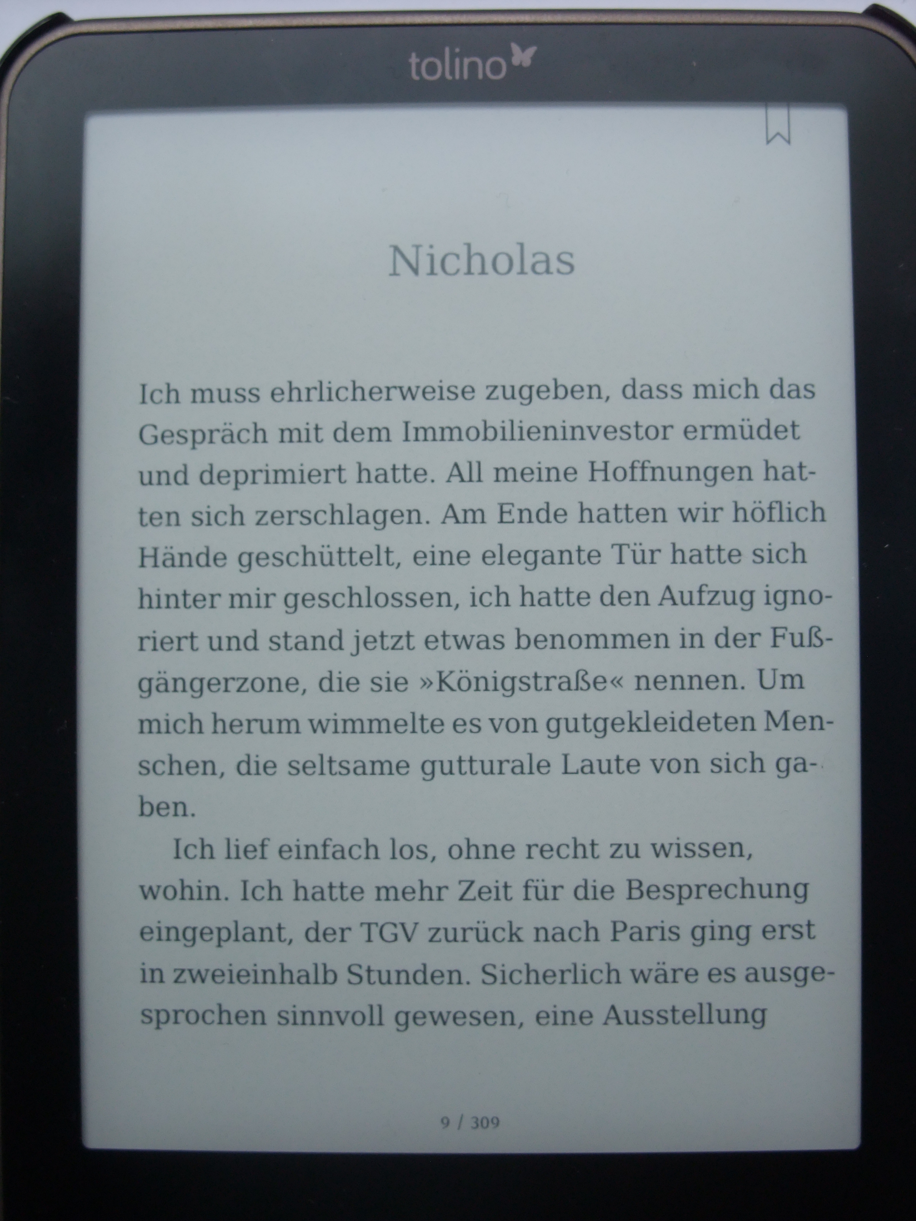 Nun, nachdem ich den Tolino im Urlaub getestet habe, kann ich vermelden: Ein E-Book-Reader ist ein Kompromiss. Es ist nicht wie Buch lesen. Es fühlt sich anders an, irgendwie nicht so heimelig. Man muss das Ding aufladen, man muss die Daten synchronisieren, man muss sich mit Adobe Digital Editions herumschlagen, es ist eben wie ein kleiner Computer, in den man sich erst einmal einarbeiten muss. Man kann den Tolino nicht einfach herumliegen lassen, weil man Angst hat, er wird geklaut. Andererseits ist das Ding so klein und handlich, dass ich es praktisch ständig dabeihabe. Wenn mir jetzt die U-Bahn davonfährt und ich 19 Minuten warten muss, klappe ich einfach den Tolino auf und lese, bis die Bahn kommt…