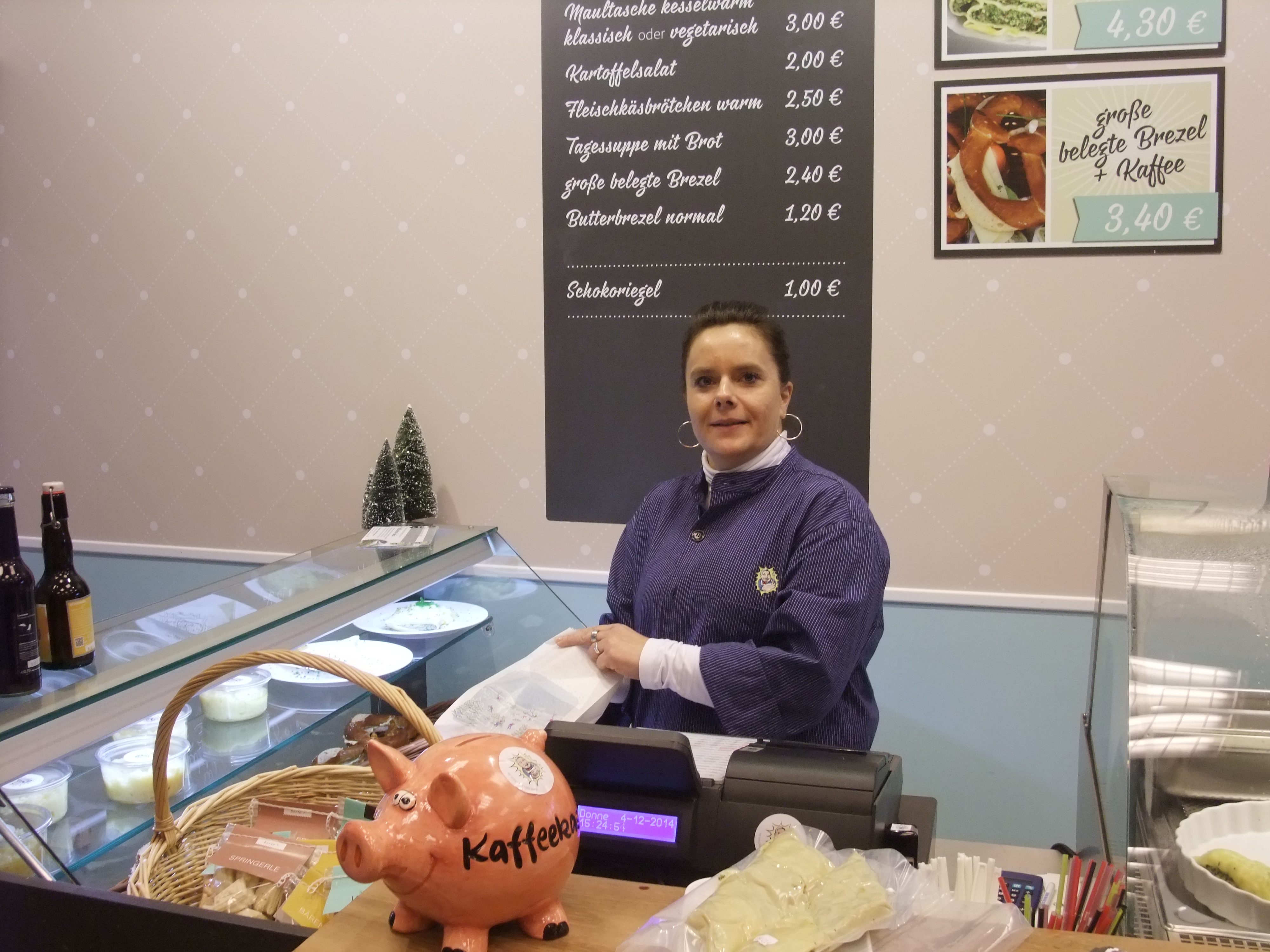 Bevor man in die Passage geht, auf der anderen Seite neben Gosch und wahrscheinlich auf Dauer findet sich Herr Kächele. Hier gibt es Maultaschen, auch vegetarische, auf die Hand und zum Kaufen, dazu natürlich den unverzichtbaren Kartoffelsalat. Außerdem verkauft Herr Kächele Marmelade der erfolgreichen Foodbloggerin „Die Landfrau.“ Die große mit Frischkäse und Tomate belegte Laugenbrezel schmeckt saulecker.