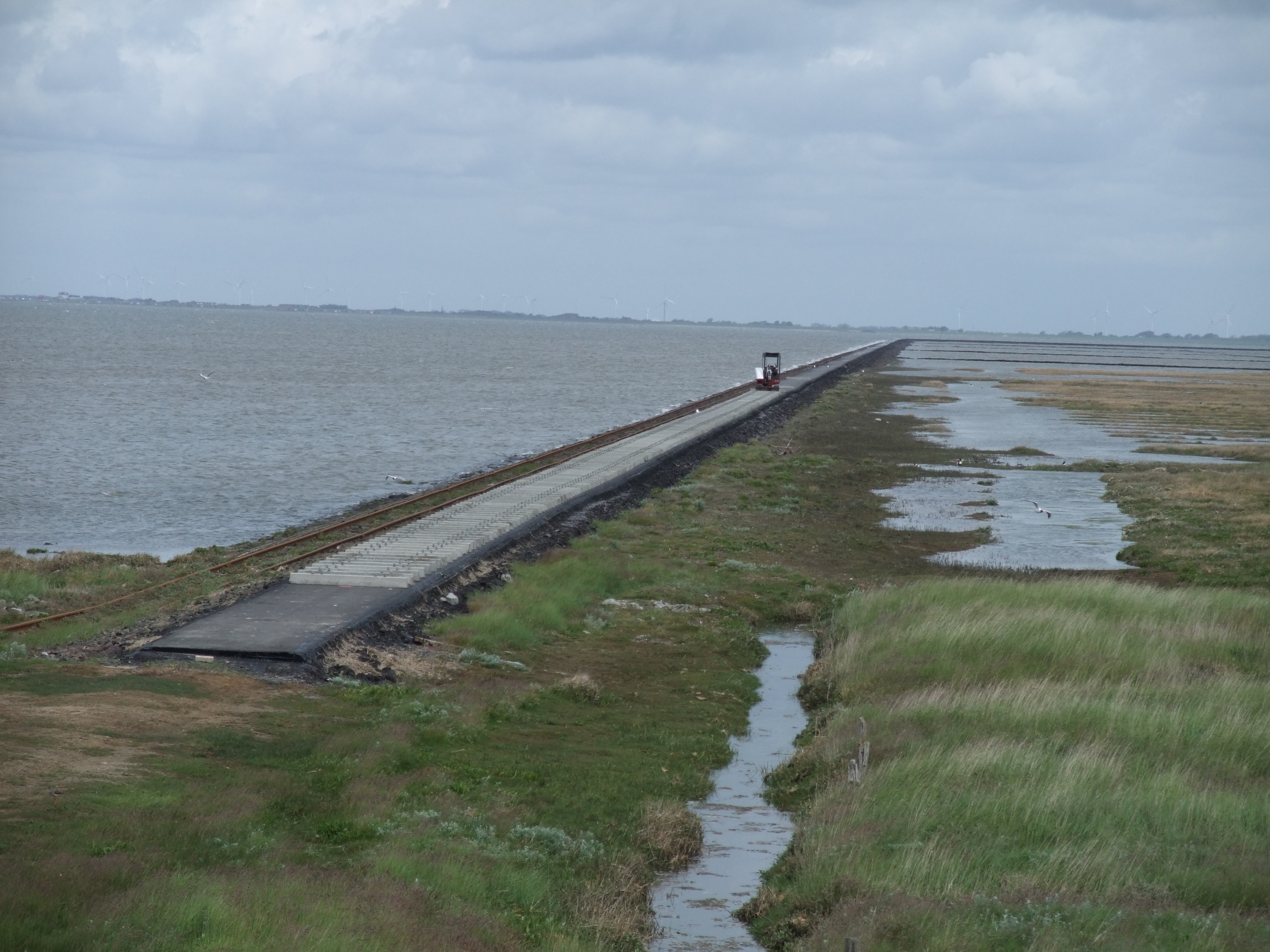 Am Montag war ich auf Langeness. Wie der Name schon sagt, ist Langeness die größte Hallig und lang, nämlich 11 Kilometer. Während man also auf Hooge ein Halligzentrum hat, die Hanswarft in der (mehr oder weniger) geographischen Mitte, gibt’s auf Langeness ein Sträßchen vom Anleger zum anderen Ende, und das ist so schmal, dass nicht einmal ein Auto und ein Rad nebeneinander passen. Da, wo die Hallig aufhört, führt ein Damm weiter durchs Wasser zur Hallig Oland. Auf den Schienen fahren die Halligbewohner mit Loren hin und her und transportieren sich selbst, Gäste und Waren. Die Loren müssen einmal im Jahr durch den TÜV, schließlich müssen Licht und Bremsen funktionieren.