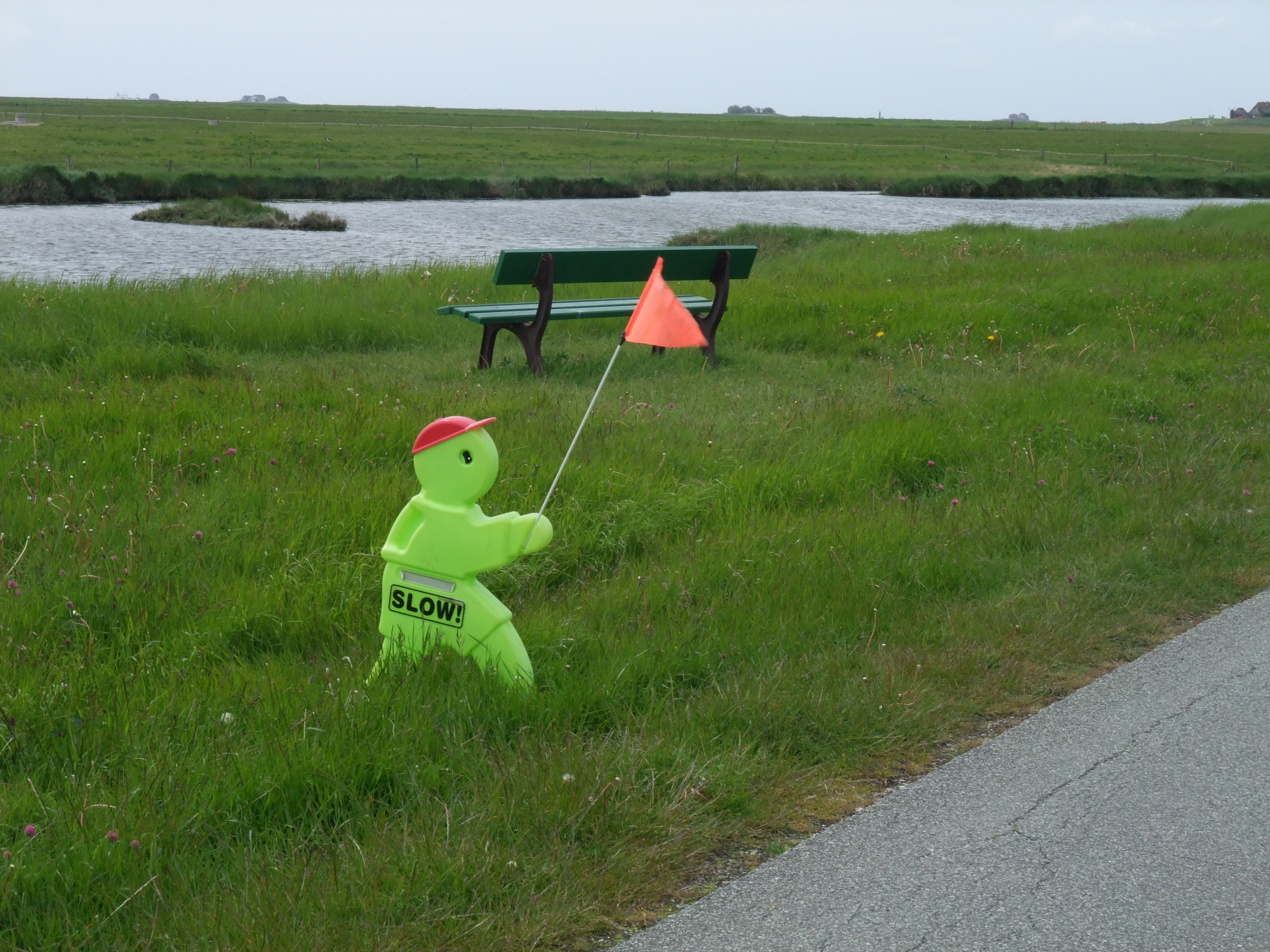 Die Loren wollte ich mir natürlich ansehen und so nahm ich das Dienstfahrrad mit auf die Fähre und radelte zum anderen Ende der Hallig. Das ging unheimlich schnell und machte richtig Spaß. Ich flog nur so an den Warften vorbei. Komisch, dass die Leute, die mir auf Rädern entgegenkamen, so gequält guckten. Auf der Rückfahrt wusste ich, warum. Der Gegenwind ist erbarmungslos. Vorher bin ich im höchsten Gang geradelt, jetzt im niedrigsten. Ich überhole eine Familie, die zu Fuß geht. Mit Mühe. An der Schulwarft steht ein Plastikmännchen und sagt „Slow“. Sehr witzig.
