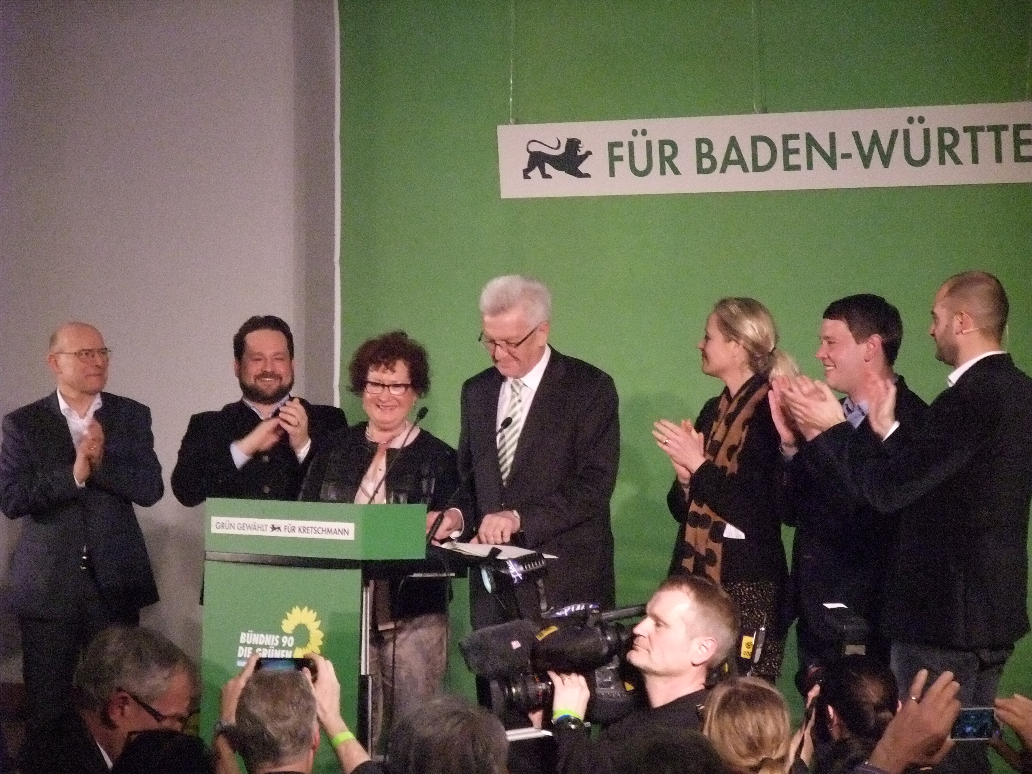 Am Anfang war der Jubel groß. Als die Hochrechnungen um 18 Uhr 32 Prozent für die Grünen vorhersagten, da wurde erst einmal heftig geklatscht angesichts dieses historischen Ergebnisses in der einstigen CDU-Hochburg Baden-Württemberg.