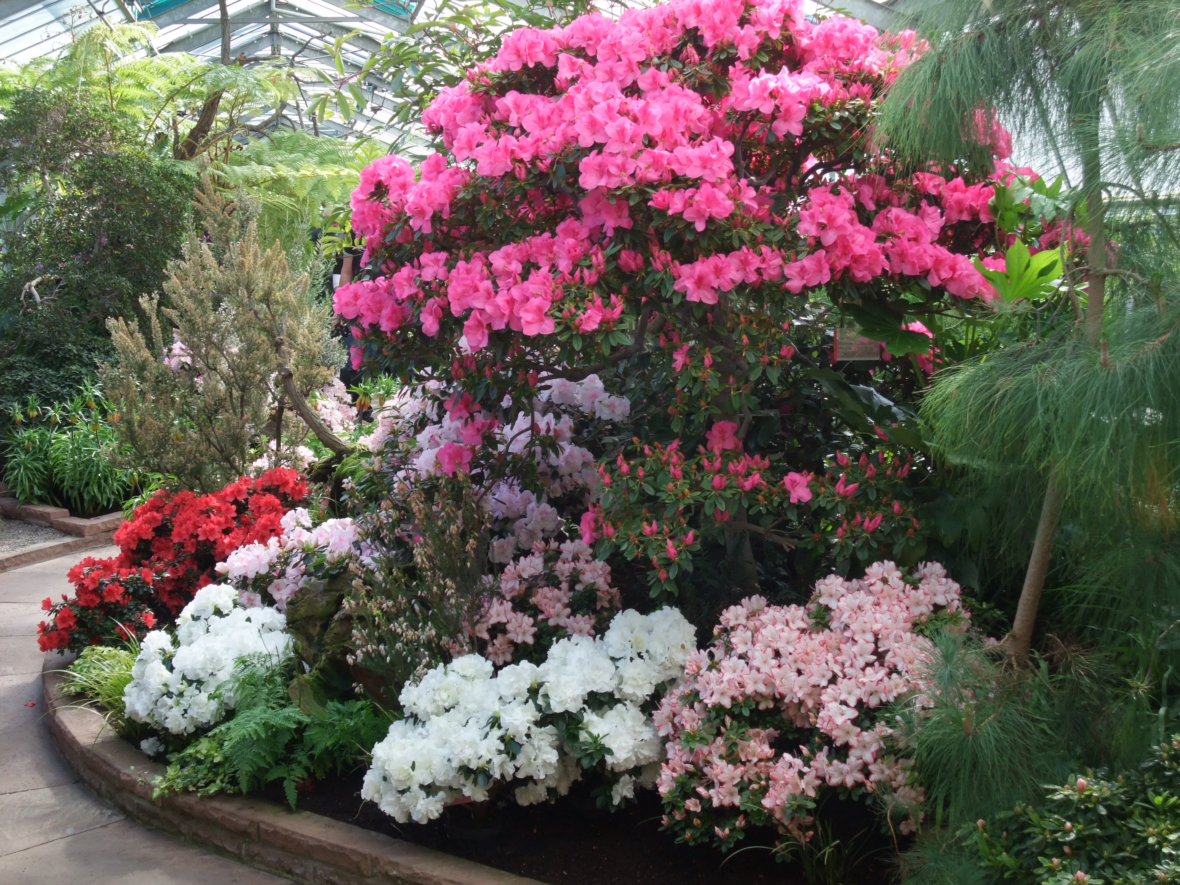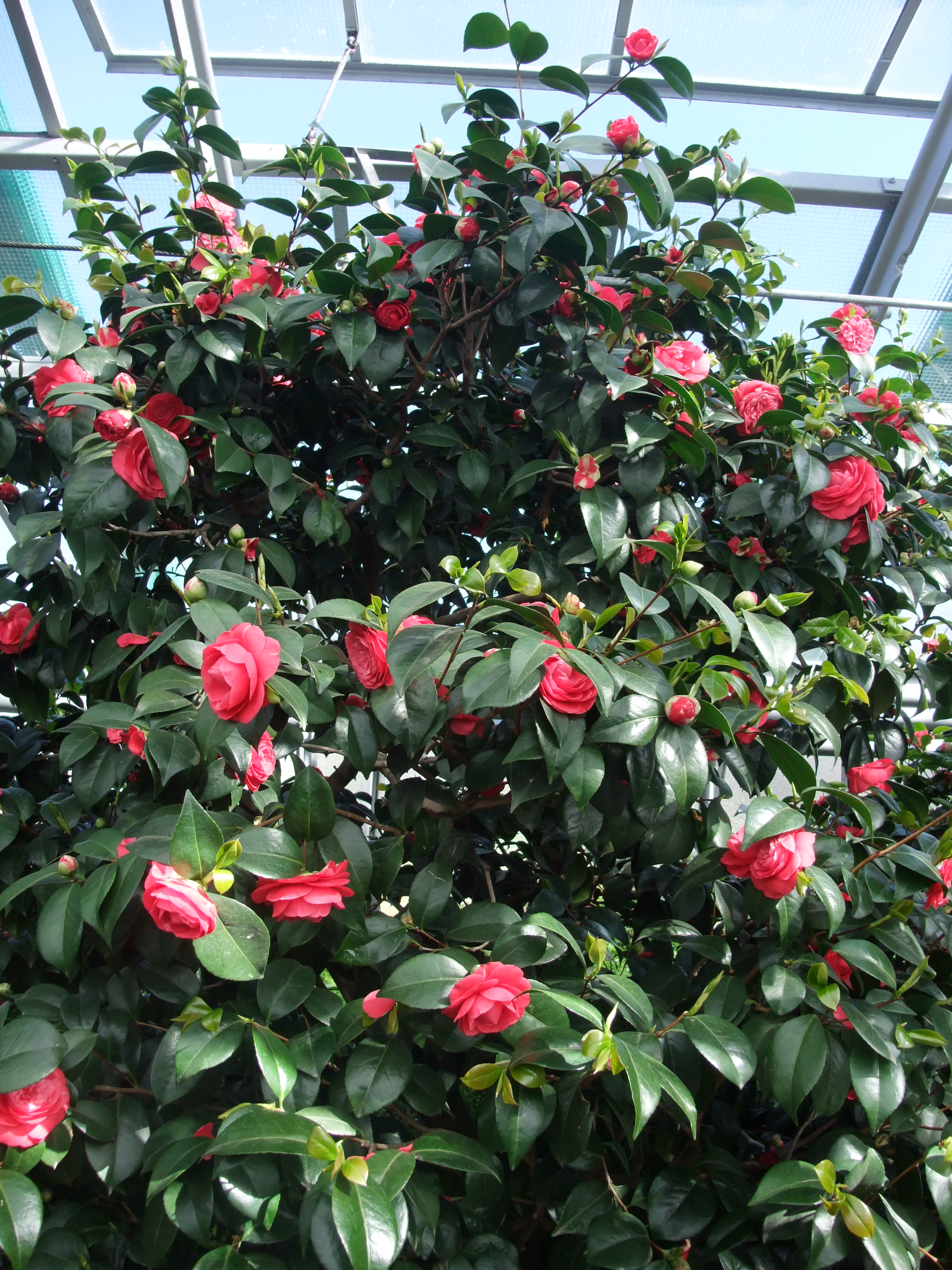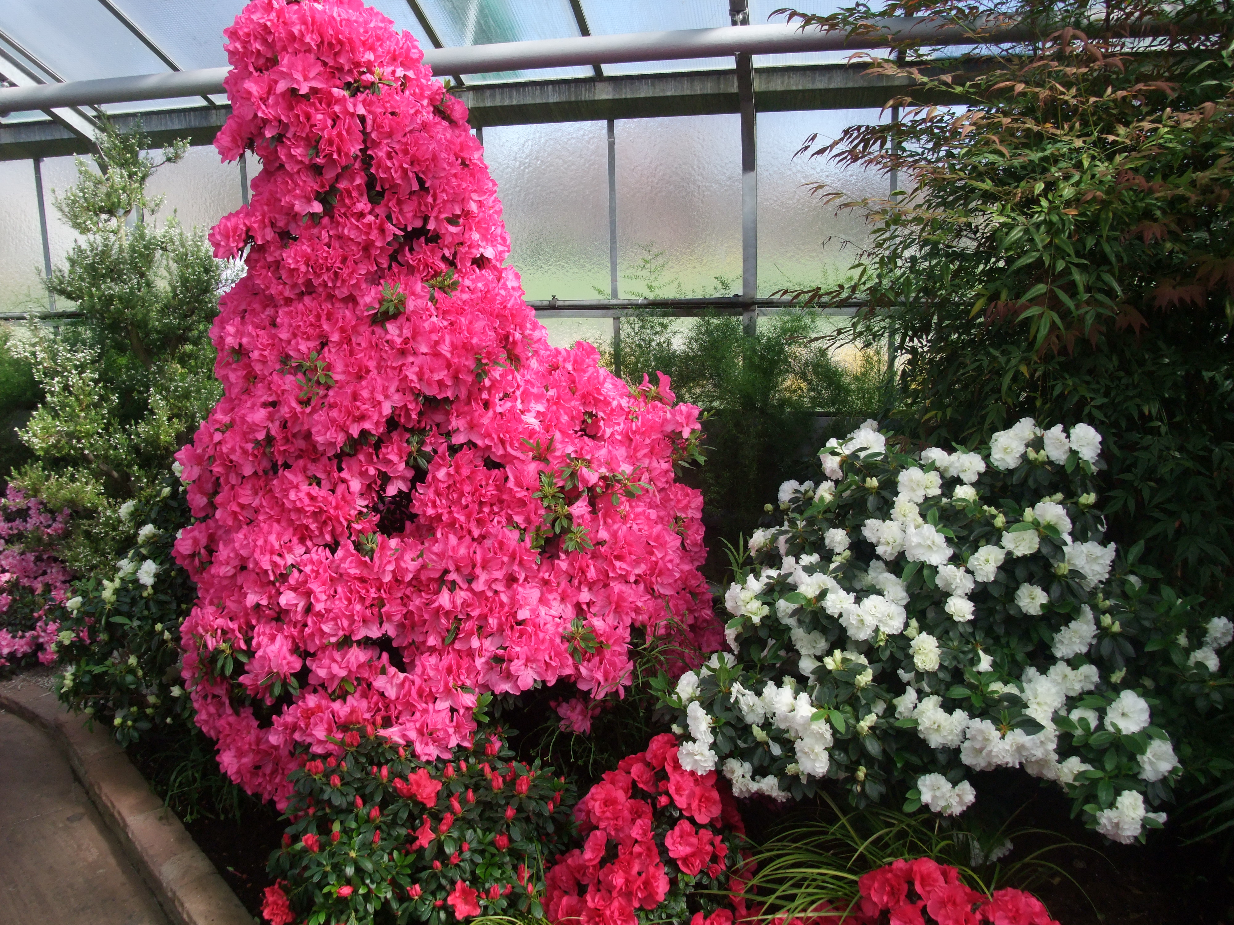 Azaleen sind Rhododendren und stammen ursprünglich aus China und Japan. Bei der Pflanze oben, die die Wilhelma-Gärtner so hingekriegt haben, fühlt man sich an eine rosa Robe aus der Oskarnacht erinnert. Mir persönlich gefallen die zarten Kamelien eigentlich besser: