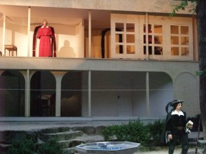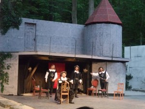 Im Wald entdeckt man nicht nur Teppiche (für alle Nichtschwaben: es besteht eine hohe Verwechslungsgefahr zwischen dem Wort Teppich = Teppich und schwäbisch Deppich = Wolldecke), sondern auch die drei Musketiere, zumindest für die nächsten paar Wochen. Zu finden sind sie im Wasenwald bei Reutlingen-Gönningen, im wunderschön gelegenen Naturtheater Reutlingen. Dort inszeniert Susanne Heydenreich vom Stuttgarter Theater der Altstadt den Klassiker von Alexandre Dumas. Während die Zuschauer bequem und regenfest unterm Dach der Zuschauerhalle sitzen, wird auf der großartigen Bühne im Wald gefochten, intrigiert, geliebt, gehasst und verfolgt. Susanne Heydenreich hat den dicken Schmöker eingedampft, indem sie einen extrem attraktiven Athos (Stefan Diener), also einen der drei Musketiere, Teile der Handlung erzählen lässt.