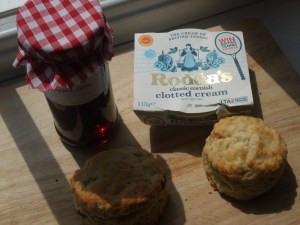 Scones isst man natürlich mit clotted cream und Erdbeergsälz, das wissen alle, die schon einmal in England waren. Kombiniert mit Tee heißt das dann cream tea. Den besten cream tea gibt es offiziell nicht in Cornwall, sondern in Devon. Hier gibt es aber an jeder Ecke scones. Die gibt es plain, also ohne alles, oder mit Rosinen.