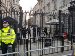 Plakate vor den Houses of Parliament:Erinnerungen an den S-21-Bauzaun werden wach
