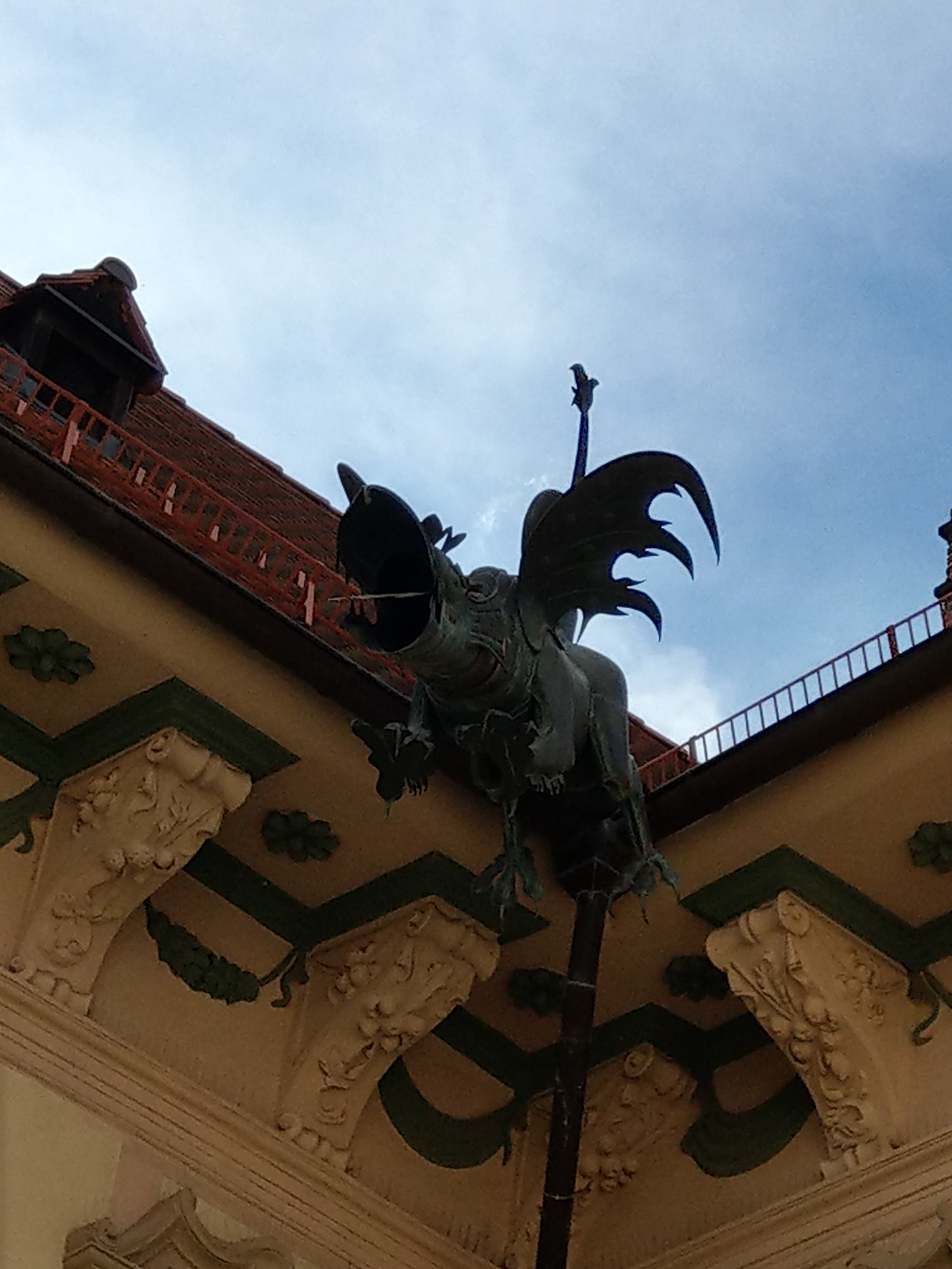 Von unserer Stadtführerin Marina erfahren wir erst einmal, dass es in Brünn alles im Doppelpack gibt: Es gibt zwei Flüsse, zwei Hauptplätze, zwei Symbole (den Drachen und das Rad), es wird zweimal an verschiedenen Stellen zu Mittag geläutet und es gibt zwei Gebäude, die das Stadtbild dominieren, die Kathedrale Peter und Paul und die Burg Spilberk. Das mit dem Drachen finde ich spannend, schließlich haben die Waliser den Drachen in ihrer Flagge und in Katalonien ist der Drachentöter St Jordi der Schutzheilige. Wir sind also schon mittendrin im Thema Europa!