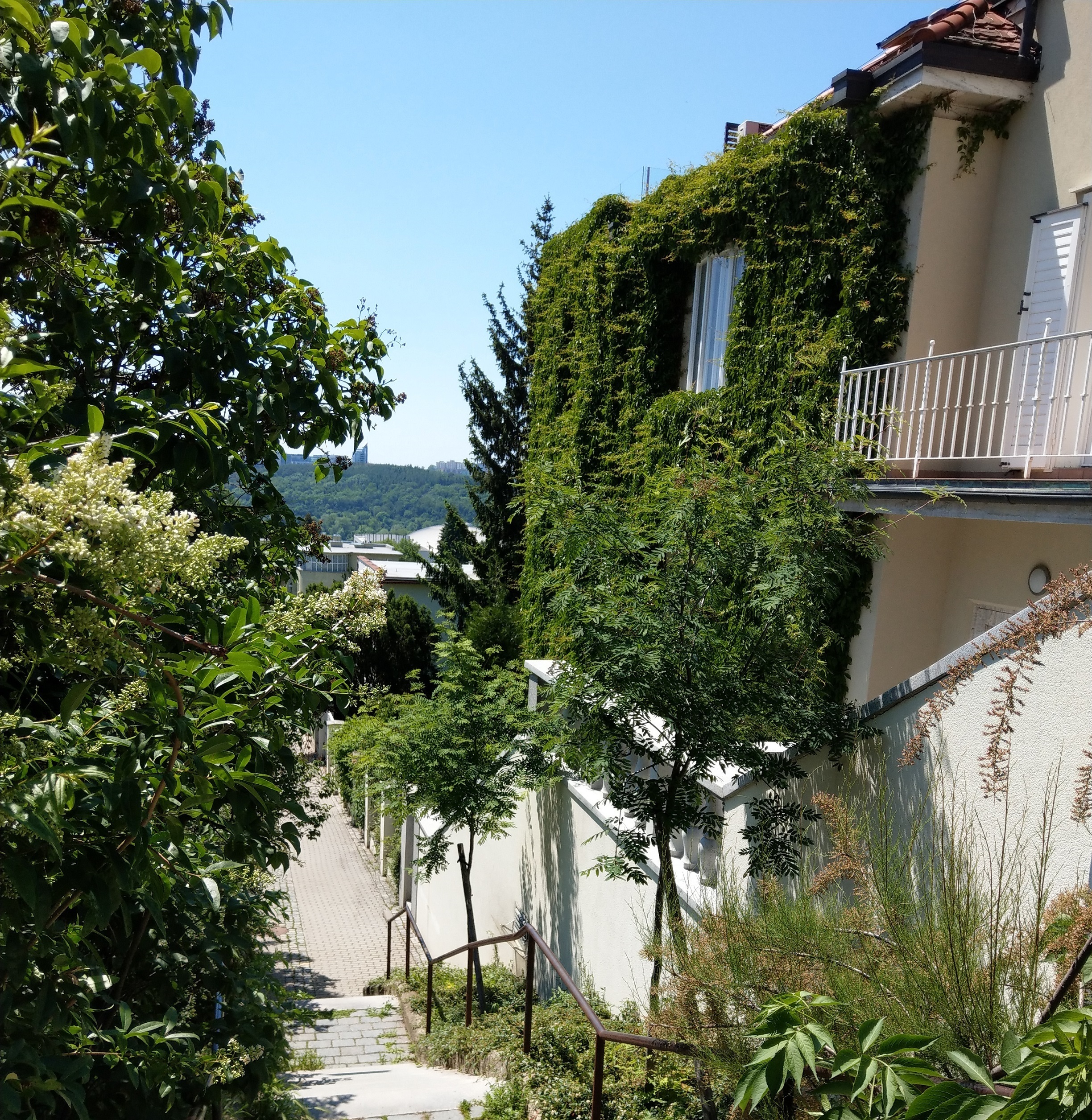 Das ist eine geologisch interessante Felsformation auf dem Vankovo-Platz im Masaryk-Viertel, die wegen ihrer Form tatsächlich als Helgoland bekannt ist. Vor lauter Helgoland weiß ich jetzt nicht mehr, wo die Villa Stiassni liegt. Eine ältere Frau weist mir den Weg. Viel Deutsch kann sie nicht, aber es reicht. „Gerade, Gerade, Gerade, Links!“, erklärt sie mir und deutet zum Himmel. „Wetter schön!“ Das Wetter ist in der Tat schön. Es ist heiß. Ich bin eindeutig in der Brünner Halbhöhe gelandet. Wunderschöne Villen, und Stäffele gibt es auch!