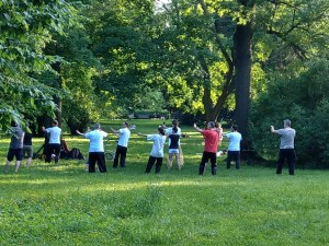 Kinder malen mit Straßenkreide, zwei Frauen machen fiese Fitnessübungen mit viel Liegestütz, jemand hat eine Hängematte zwischen zwei Bäume gespannt. Sport im Park so wie in Stuttgart gibt es auch, gleich zwei Gruppen machen Tai-Chi.
