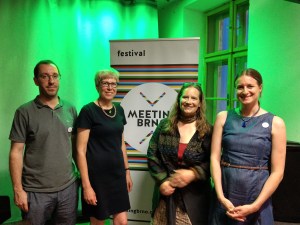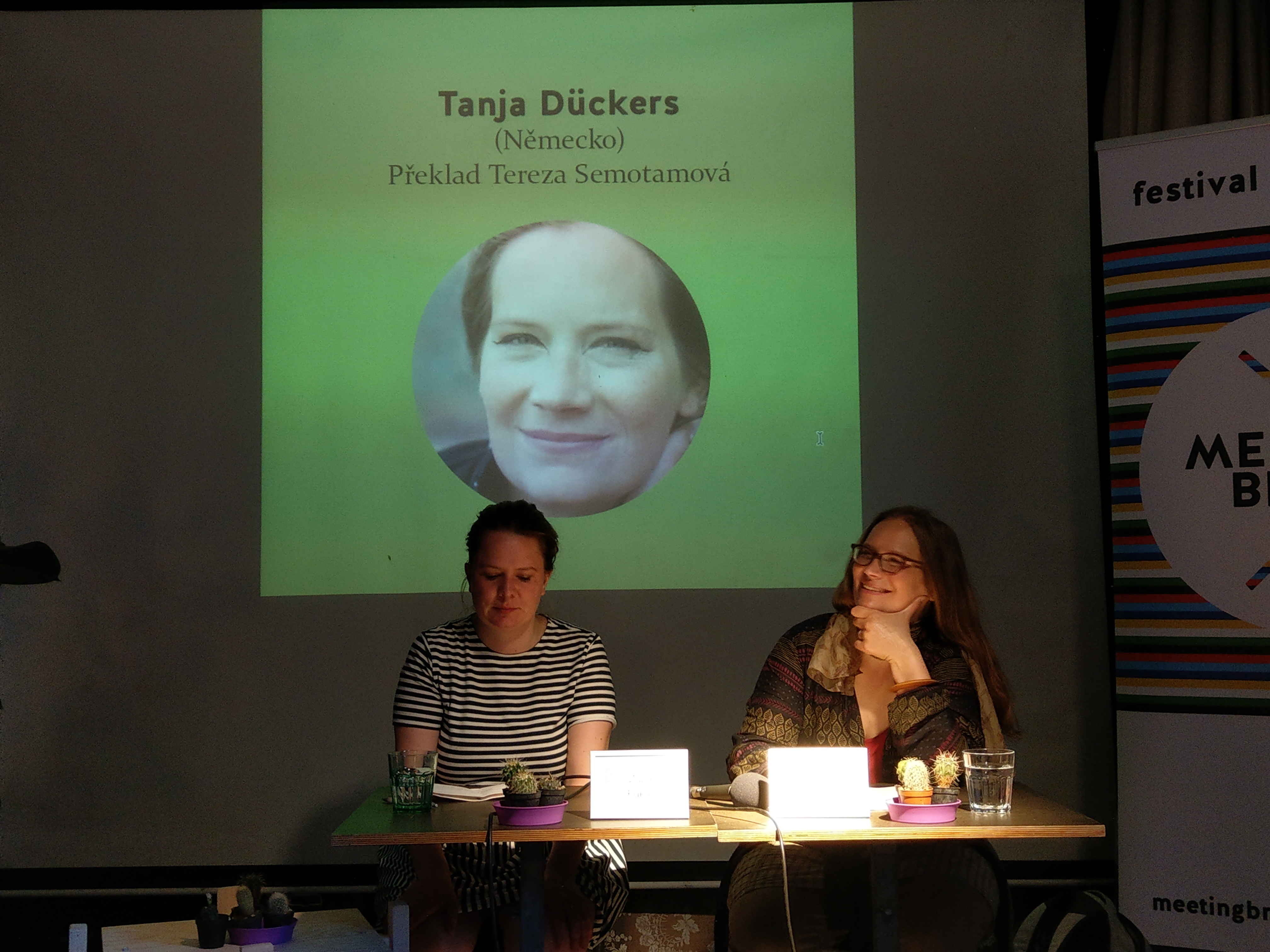 „Jetzt sind wir aber froh, dass Sie da sind!“, werde ich am Abend bei einer Lesung empfangen. Nein, ich bin zwar Autorin, aber die falsche. Tanja Dückers kommt aus Berlin, hat dank der Pünktlichkeit der Deutschen Bahn drei Stunden Verspätung und kann deshalb ihre Lesung im Rahmen des Festivals „Meeting Brno“, das auch den Versöhnungsmarsch organisiert, nur mit Verspätung beginnen. Trotz offensichtlicher Erschöpfung liest sie sehr konzentriert die Kurzgeschichte „Lux Aeterna“, in der es um Demenz geht, die tschechische Übersetzung wird parallel auf die Wand projiziert. Eine deutsche Lesung in Brünn, das ist doch mal was!