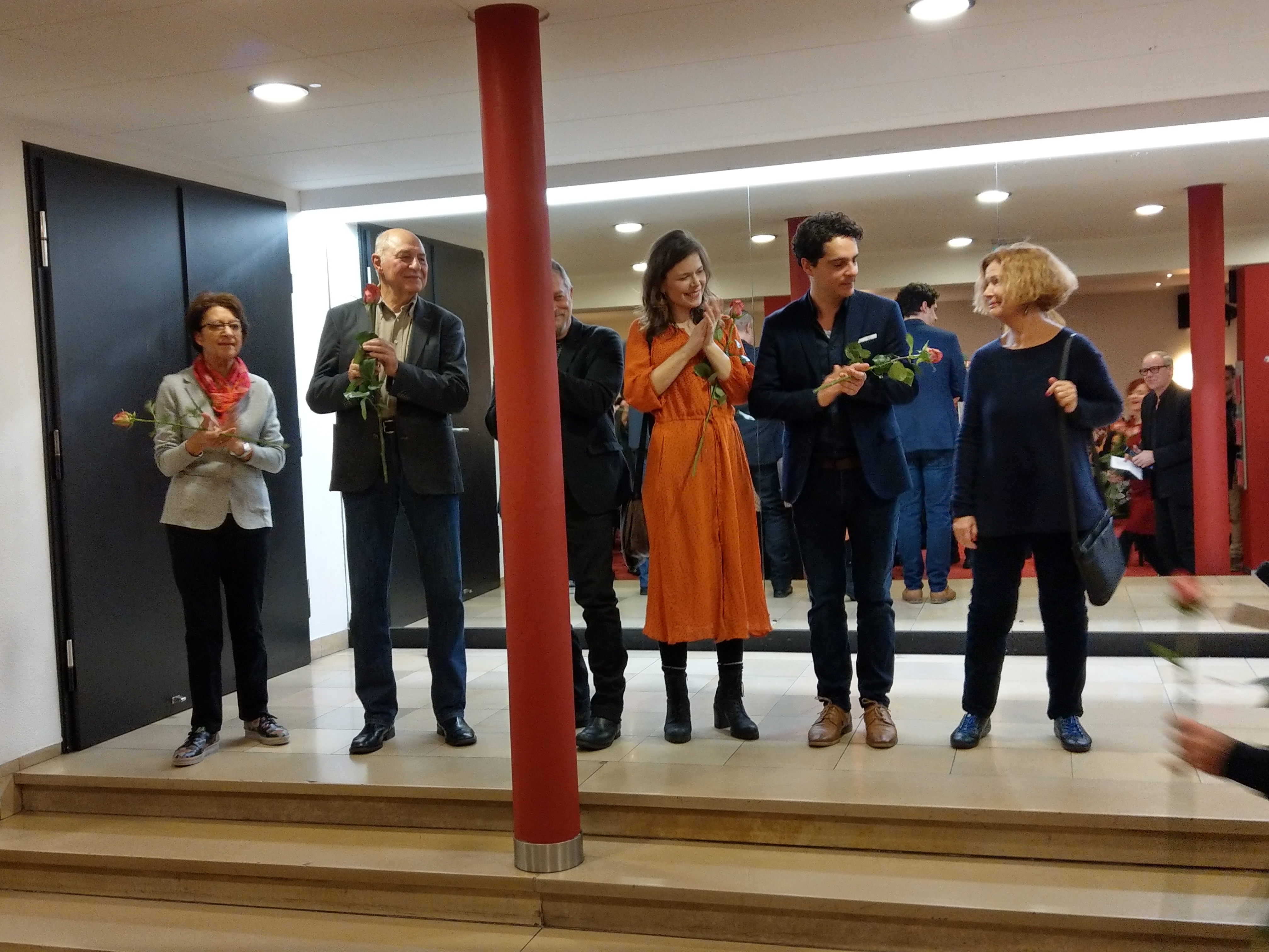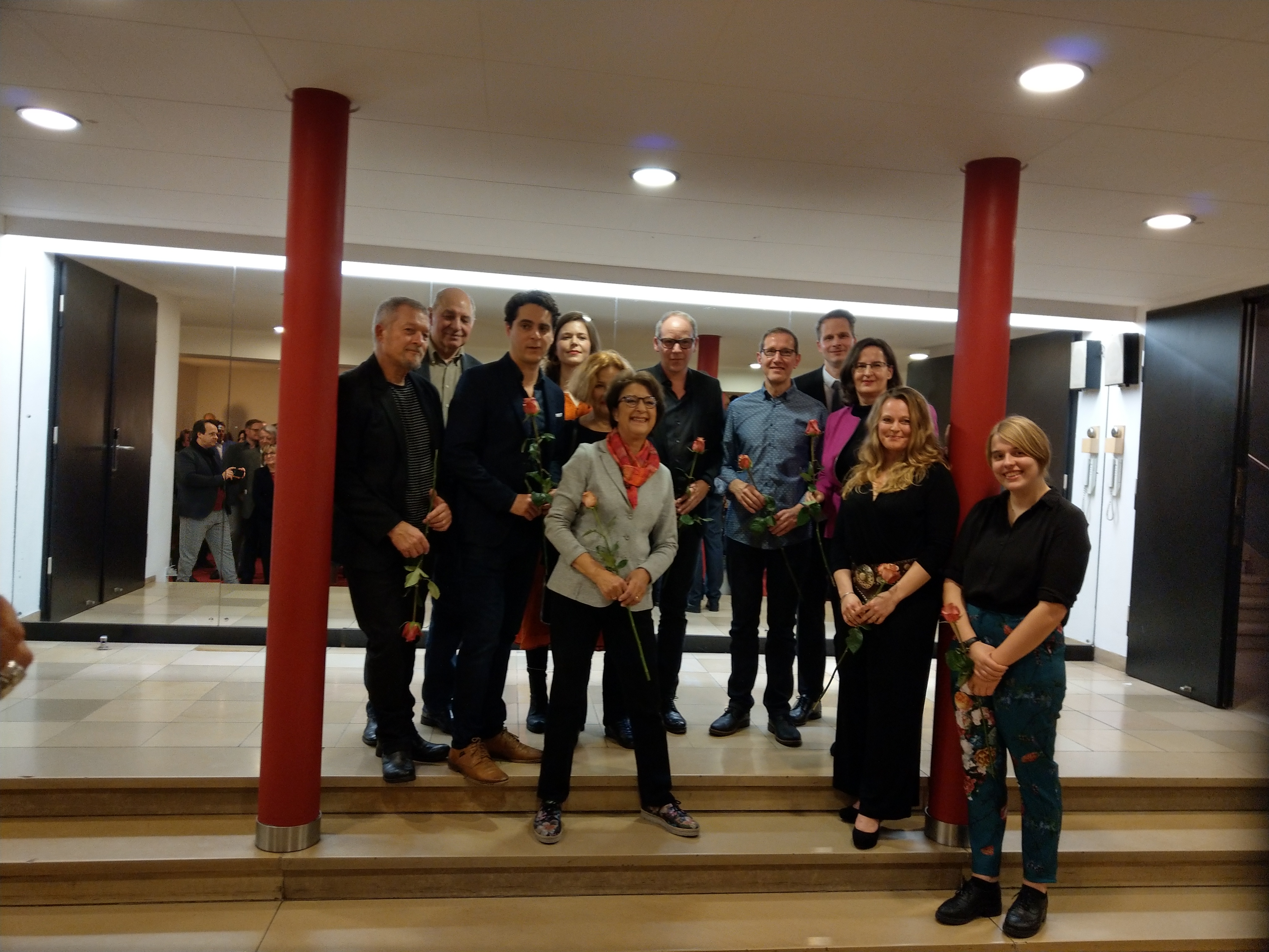 DarstellerInnen und Regisseur Axel Preuß präsentieren sich bei der Premierenfeier