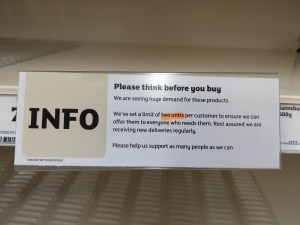 Großbritannien hätte sich vorbereiten können, man hätte aus dem Beispiel Italien und Deutschland lernen können, viel früher reagieren, viel schneller das öffentliche Leben einschränken können. Es wäre bedingt durch die Insellage relativ einfach gewesen. Das ist nicht passiert. Es scheint so, als meinte nicht nur die Regierung, sondern auch immer noch viele Briten, das alles passiere in Europa – womit sie nicht sich selber meinen – aber doch nicht hier. Man lässt sich schließlich nichts vorschreiben. Und so ist das eine fahrlässige Fortsetzung der Brexit-Politik, die unzählige Menschen das Leben kosten wird. Noch immer müssen wir beim Einkaufen sehr darauf achten, dass uns niemand zu nahe kommt, noch immer sehen uns manche Leute an, als seien wir komplett hysterisch, wenn wir beim Spazierengehen einen großen Bogen um sie machen. A propos Einkaufen, wenn in Deutschland gehamstert wird, dann ist das ein Witz im Vergleich dazu, was hier passiert. Klopapier gibt es seit gut einer Woche nicht mehr – jedesmal, wenn wir in den Supermarkt kommen, heißt es, die Regale seien aufgefüllt, aber von den Leuten wie Heuschrecken wieder leergeräumt worden. Nun gibt es Beschränkungen bei der Anzahl bestimmter Produkte, und bestimmte Einkaufszeiten für ältere Menschen und Pflegepersonal. Ein Video erschütterte das Land, auf dem eine in Tränen aufgelöste Krankenschwester sagte, sie würde den ganzen Tag ihr Leben für Patienten riskieren, nur um dann am Abend in einen vollkommen leergeräumten Supermarkt zu kommen.