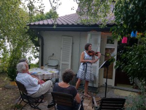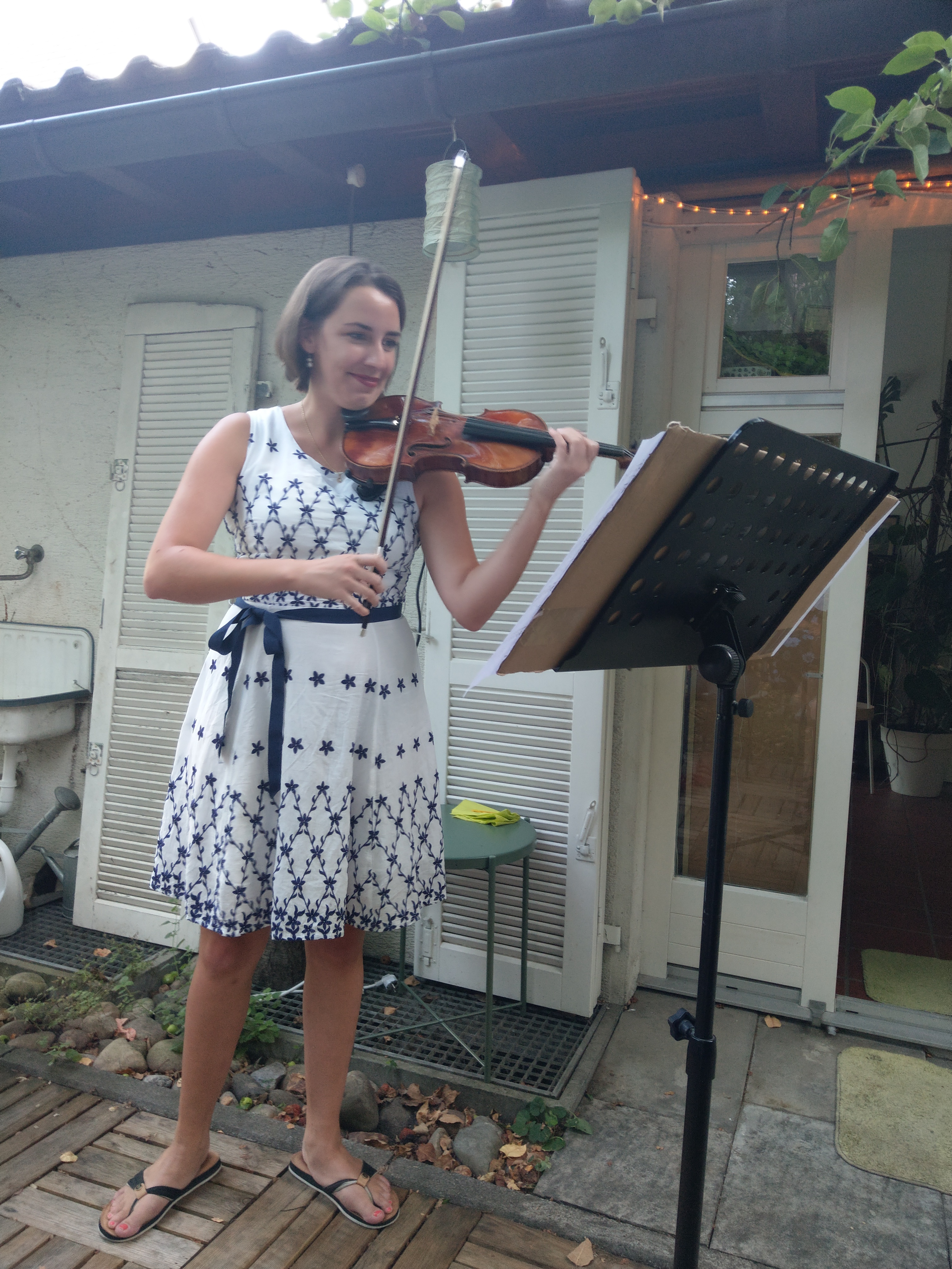 Noch ein staycation-Tipp gefällig? Wie wäre es angesichts geschlossener Konzerträume einmal mit einem ganz privaten Hauskonzert? Swantje Tauscher ist gerade mit ihrer Ausbildung als klassische Geigerin fertig geworden – mitten in der Corona-Krise. Sie hat in Innsbruck studiert und ihre Prüfung mit Auszeichnung bestanden. Der Zeitvertrag beim Tiroler Sinfonieorchester platzte. Zur Untätigkeit verdammt wie wir alle, die wir vor Publikum auftreten, hat sie sich nun auf private Konzerte im kleinen Rahmen verlegt, und man kann sie dafür buchen. So hat das eine Freundin von mir als Geburtstagsüberraschung für eine andere Freundin gemacht, und es war ein voller Erfolg! Die nichtsahnende Freundin, die eigentlich „nur“ zum Abendessen in den Garten eingeladen war, zumindest dachte sie das, wurde mit Aperitiv und Vorspeise bedacht, und dann tauchten erst ein paar eingeweihte Nachbarn auf, die sich schweigend Klappstühle schnappten und im Garten verteilten, worüber sich die Freundin etwas wunderte, und dann kam Swantje in einem wunderhübschen Kleid mit einer Geige in der Hand in der Abenddämmerung aus dem Haus und begann zu spielen. Und was soll ich sagen – es war einfach grandios! Swantje spielte Stücke für Solo-Violine wie beispielsweise die Vocalise von Rachmaninov, die Thai-Meditation von Jules Massenet oder Après un rêve von Fauré. Dazu rezitierte sie Gedichte oder erzählte kleine Geschichten – und das alles ging direkt hinein in Herz und Seele, nachdem wir soo lange auf live gespielte Musik verzichten mussten! Dann wurden die Lampions angezündet und als Zugabe spielte Swantje das Adagio aus Bachs G-Moll-Sonate für Solo-Violine. Als der letzte Ton verklungen war, war es erst einmal ein paar Sekunden mucksmäuschenstill, und dann gab es donnernden Applaus für die wunderbare Musik und Performance! Wer Swantje buchen will, auch in Kombination mit anderen Musikern, kann sie über ihre Homepage kontaktieren: http://www.swantje-tauscher.de.